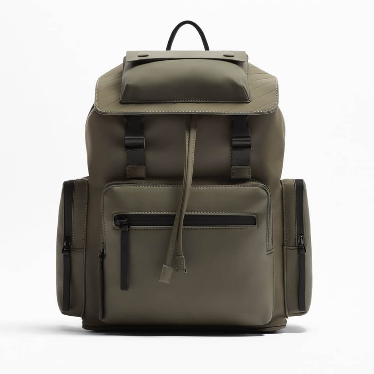 Soft rubberized backpack available in several colors. Features a front zip pocket, two side pockets, a handle and two adjustable straps. Inside there is a zippered pocket and a pocket for electronic devices and laptops up to 13 inches. The upper part folds forward and fastens with magnets. The main compartment is closed with a hermetic zipper.